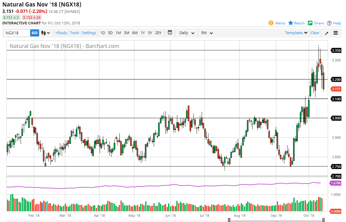 Natural gas markets initially tried to rally during the Friday session, but sold off rather drastically as we sliced through the $3.20 level, and then reached towards the $3.15 level underneath. I believe that this point, the $3.10 level should be a target as well. If we get below there, then I think we could unwind down to the $3.00 level. The reason I’m so bearish in the short term is that we have a massive shooting star on the weekly chart, which of course is a very negative sign and of course we are overbought. At this point, I think that the market probably needs to pullback in order to find buyers again.