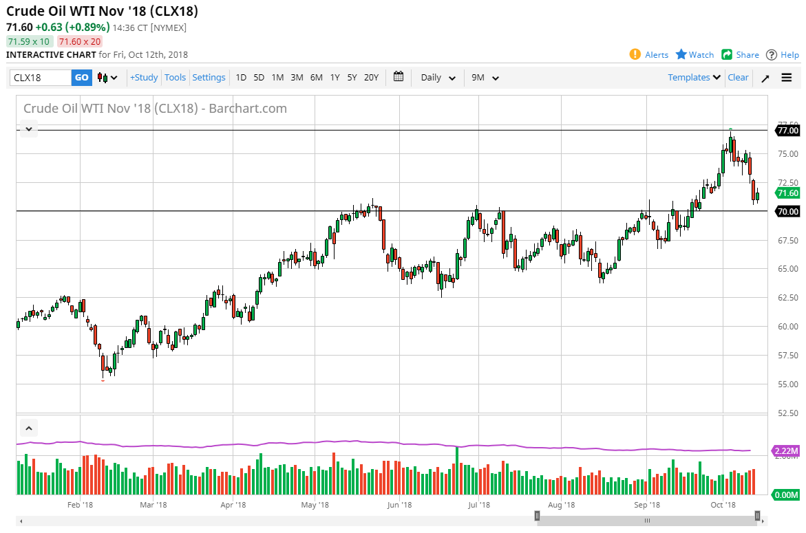 The WTI Crude Oil market rallied slightly during the day on Friday, as we have seen extraordinarily high amounts of volatility. It looks as if the $71 level is trying to offer significant support, and I think that given enough time we will probably see the buyers step into this market. Perhaps the Friday session was a harbinger of the market looking for value. Perhaps we are starting to see a lot of support near the $70 level, and I think that we will eventually go higher. Ultimately, there are plenty of reasons to think that the oil market should continue to go higher, not the least of which will be Iranian sanctions. If we break down below the $70 level, then I think that we will find plenty of support underneath as well, especially near the $67.50 level. I think we have one more surge higher in the oil market left, and if the US dollar starts to sell off that should be a catalyst enough.