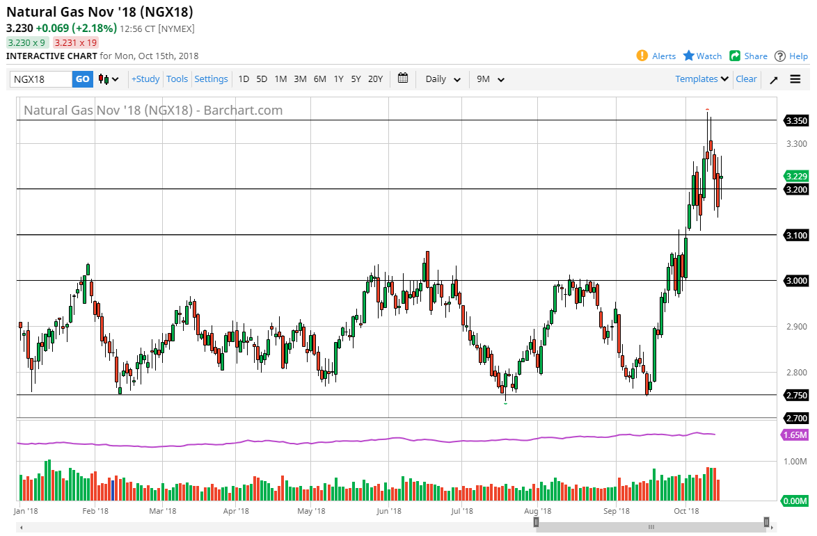 Natural gas markets went back and forth on Monday, essentially undecided as to where it wants to go next. It looks like the $3.30 level is going to offer support, and we found buyers near the $3.15 level. The neutral candle suggests that we are trying to figure out where to go next, but it should be pointed out that we’ve had a couple of very negative candles in the last several days, and of course we are very overbought at this point, so a pullback would not be much of a surprise. I think that the $3.10 level is going to be massive support, just as the $3.00 level will be. I believe in looking for value underneath, but short-term traders may try to sell.