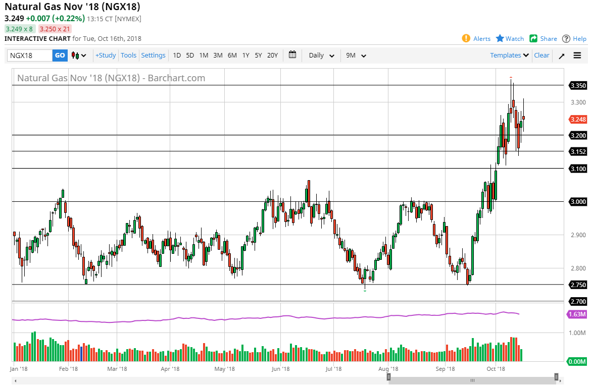 Natural gas markets went back and forth during the trading session as well, as we continue to see a lot of volatility. We have gotten a bit too far to the upside, and of course have shown signs of exhaustion. I think at this point, we will probably continue to consolidate between the $3.10 level and the $3.30 level. I would expect a lot of choppiness at this point, and although I am very bullish, I recognize that we need to pull back a bit or at least grind sideways to catch our breath after the straight shot higher that we had seen previously.