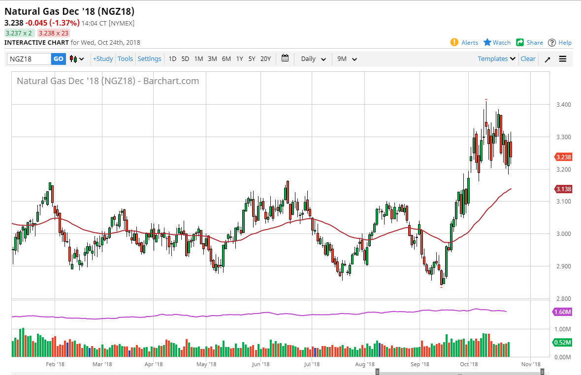 Natural Gas traders had a rough day as we went back and forth on Wednesday, hovering above the $3.20 level in the December contract. It looks as if the market will continue to bounce around in this general vicinity, and I think although we are in a seasonably bullish time of year, the reality is that there is the possibility of a “El Niño winter” in the United States, which would keep the temperatures in America little higher than expected. Pay attention to that, and if you hear the phrase “El Niño”, that is a bad thing for natural gas.