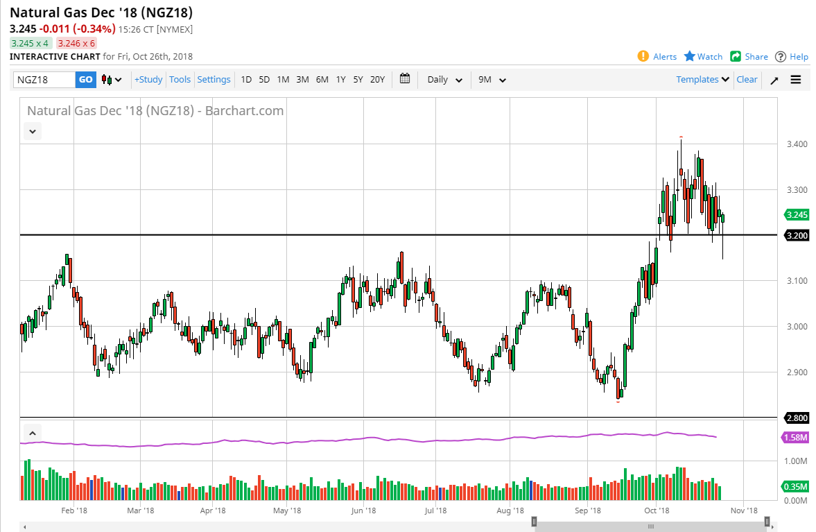 Natural gas markets broke below the $3.20 level but turned around of form a massive hammer. Because of this, I think we stay within the overall consolidation that we see just above that level, with the top of it being near the $3.40 level. If we break below the bottom of the hammer for the Friday session, that would be a very negative sign, as it would show that the market was reentering the previous consolidation area. At this point though, it looks like simple back-and-forth trading will continue to be the way forward, as natural gas is in a seasonally bullish time of year, but obviously we have a lot of conflicting concerns, not only the strength of the US dollar but potential demand as well. Not only is there concern about the economy suddenly, but there is also the possibility of an “El Niño” hitting the United States this winter, keeping temperatures warmer than usual.