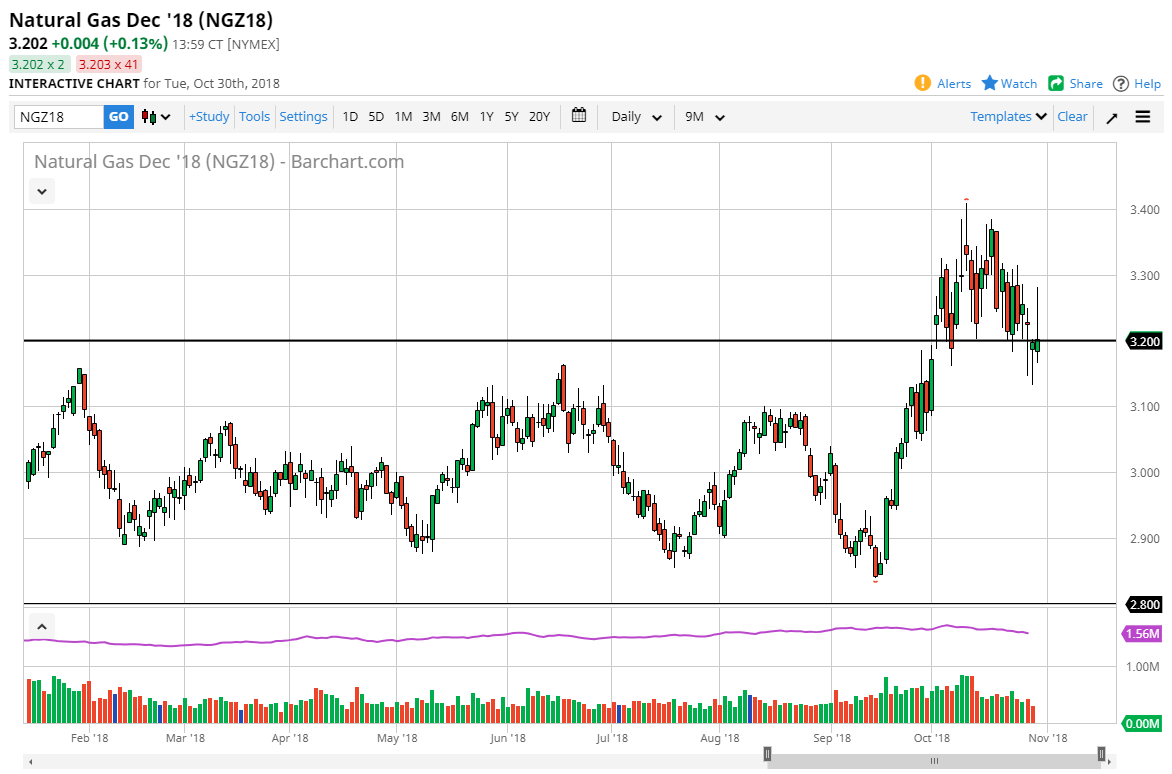Natural gas markets continue to be very volatile, and initially rallying during the day on Tuesday, but rolled over and sold off rather hard. That of course is not a good sign, and I think it is simply a market that is trying to find a reason to break down. It looks as if the winter in the United States may be warmer than originally anticipated, and that of course is very bearish overall as we have quite a bit of supply in the United States which of course can continue to fulfill most demand. If we don’t have enough demand to burn through the supply, natural gas will break down below the $3.10 level and then reenter the previous consolidation area, perhaps opening the door to the three dollars handle.