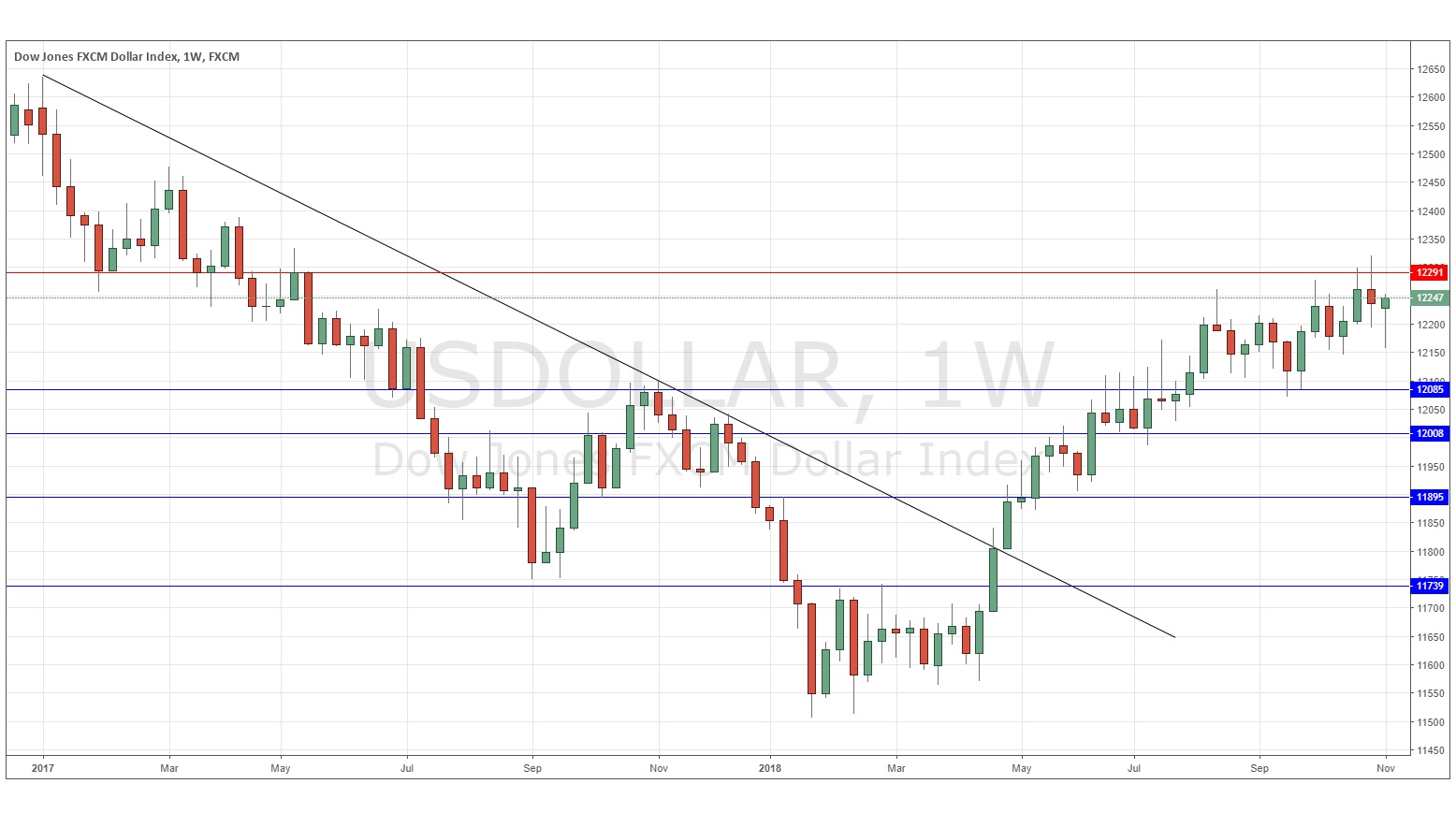 The weekly price chart below shows that after last week’s bullish candlestick, the price remained mostly unchanged over this week, printing an inconclusive semi-doji candlestick, which also rejected the resistance level at 12291. The price remains within a multi-week consolidation between support and resistance and I have no strong confidence as to short-term direction, although the edge is still technically in line with the long-term bullish trend, which remains intact. Another bullish sign is that we have seen higher prices over each of the past three weeks.