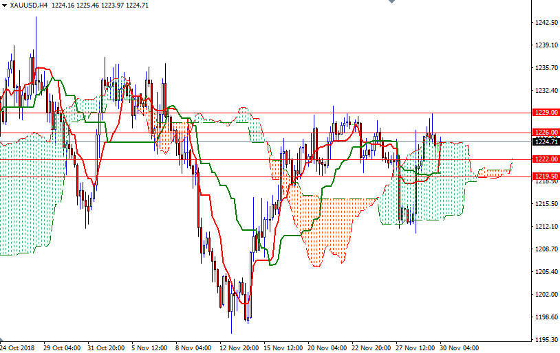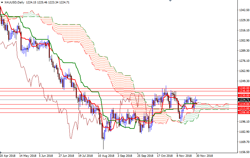 The market is trading above the Ichimoku clouds on the daily chart, and we have positive Tenkan-Sen (nine-period moving average, red line) - Kijun-Sen (twenty six-period moving average, green line) crosses. However, the upside potential will be limited until the technical resistance in the 1240/36 area is successfully broken. Of course, the bulls have to pull prices above the initial barrier at around 1230 to reach there.