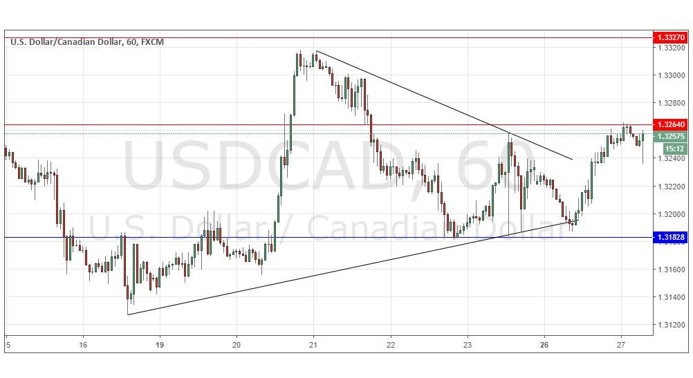 I wrote yesterday that the picture now looked uncertain with wide swings but no real direction, with the price contained within a medium-term consolidating triangle as it is also in a few other important currency pairs. I was looking for a strong break below 1.3182, but that area held, and the price went the other way to eventually break bullishly out of the triangle. The outlook is more bullish with the USD advancing everywhere, and if the price can convincingly break above 1.3264 the picture will become much more bullish, so I would take a bullish bias at that point if it happens.