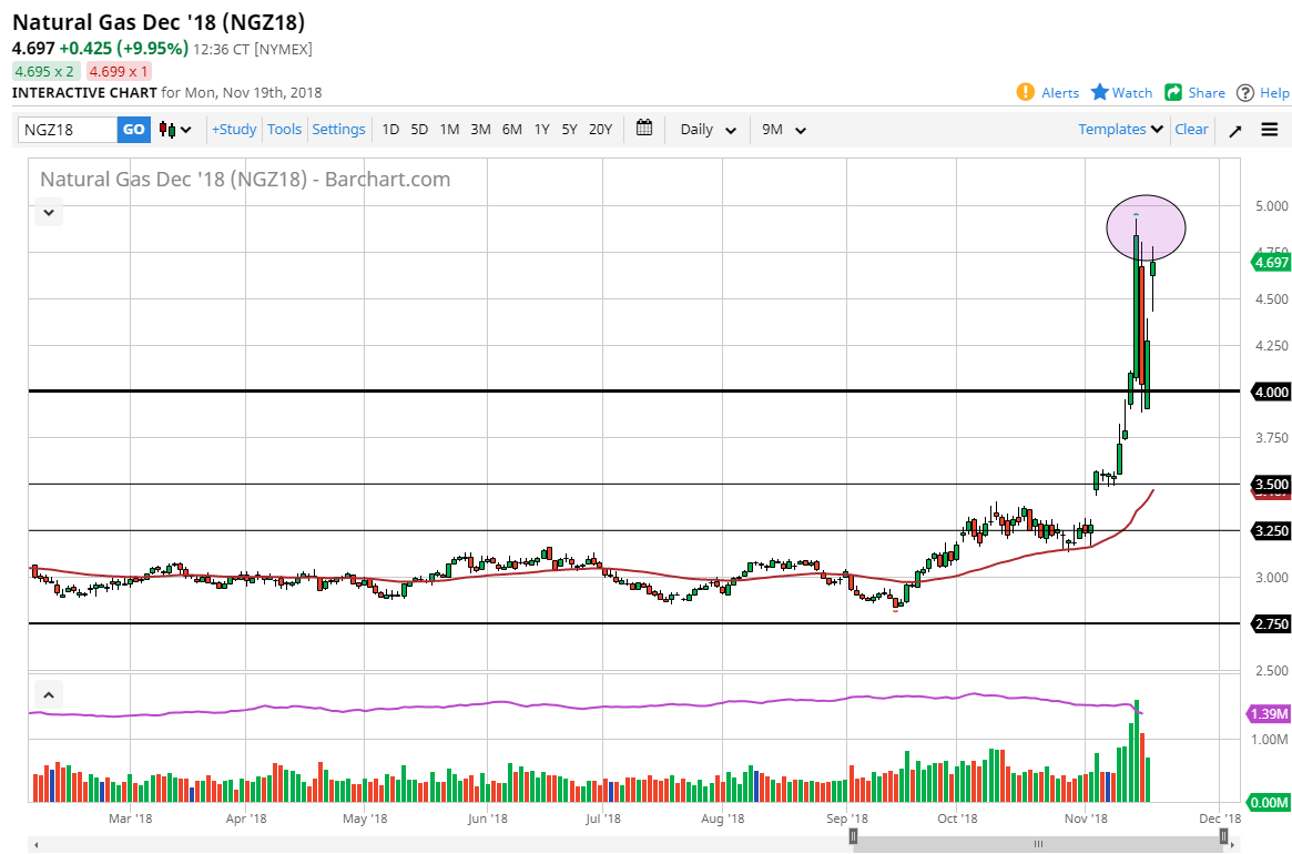 Natural gas markets gapped higher at the open on Monday, but then pulled back a little bit during most of the day only to bounce again. However, I think there is a massive amount of resistance just above, and I would also point out that the volume was very thin during Monday trading. Because of this, I think that we are going to see sellers come in on signs of exhaustion, as even though we have seen quite a bit of burning of supply, but longer-term we obviously have a lot of natural gas available for drilling, and I think it’s only a matter of time before we see this market roll over again. We are trading the winter months in the futures market right now, but before you know it, we will be rolling over to trade the spring months in the United States which will drive down demand.