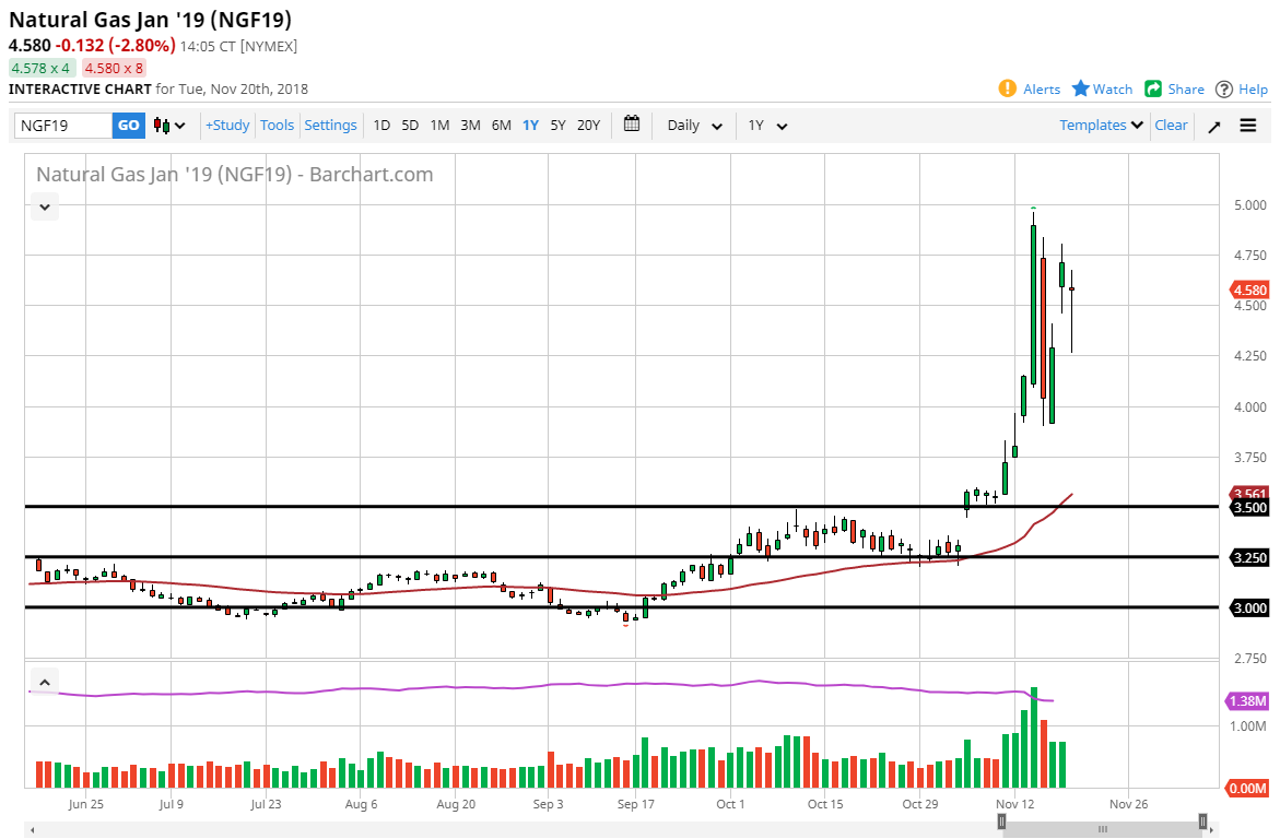 Natural gas markets went back and forth during the trading session on Tuesday, as we have formed so much in the way of a very volatile situation. I think at this point, we have filled the gap from a couple of days ago, but we will still probably find exhaustion above. The $5.00 level is also psychologically important, so it’s only a matter of time before sellers get involved. If we break down below the $4.25 level, that probably opens the door to the $4.00 level next.