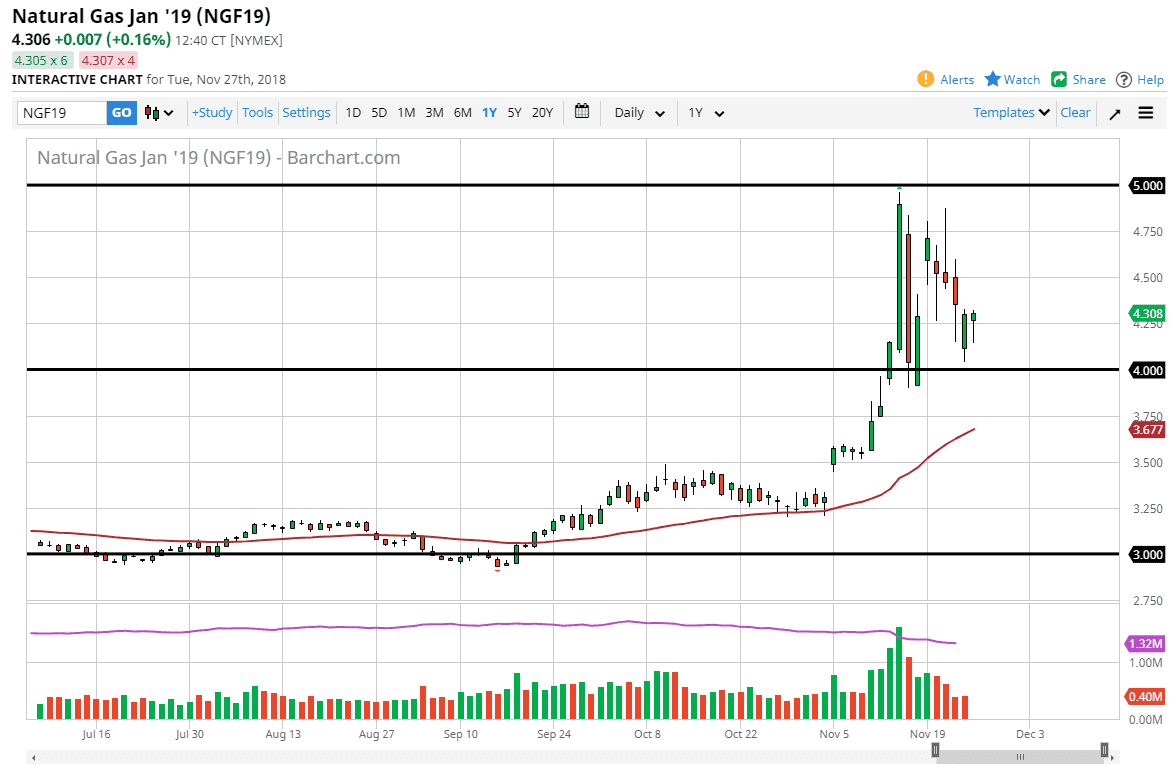 Natural gas markets initially fell during Tuesday but turned around to show signs of life. The market continues to be very noisy, as we have been over bought and of course it is the seasonally bullish time of year as temperatures in the United States are cold. However, at these high levels suppliers will certainly jump into the market and start dumping as much natural gas as they can, and I think it’s only a matter of time before break back down. In the meantime, I believe we consolidate between the $4.00 level on the bottom, and the $5.00 level at the top.