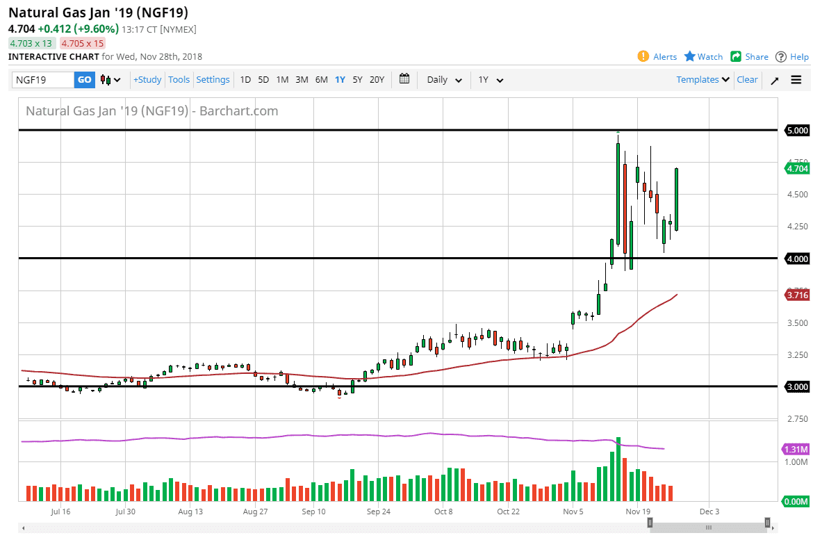 Natural gas markets rallied significantly during the trading session on Wednesday, reaching the $4.75 level. That’s an area that of course is rather important as it is the beginning of major resistance extending to the $5.00 level. I think that’s the high for the year, but it is rather cold in the United States of demand is still certainly therefore natural gas. That being said, I think that it’s only a matter time before suppliers flood the market with more of the commodity, as these high prices are very attractive.