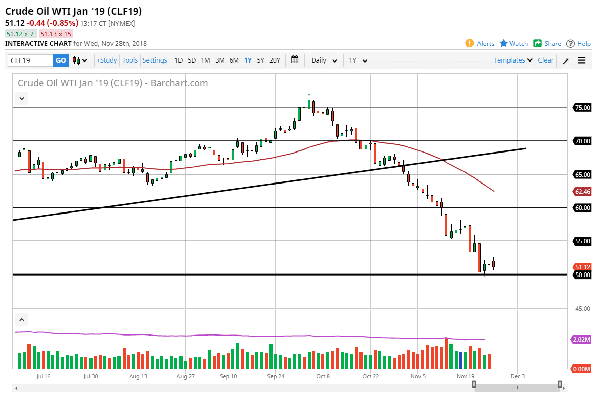 The WTI Crude Oil market broke to the downside again on Wednesday, reaching towards the $50 level. This is an area that of course is psychologically significant, so it makes sense that we could see a bit of support here. However, if we break down below the $50 level, then the market will probably go down to the $48 level. However, I would expect to see a lot of support at the $50 level, as it is such an important figure. It’s been an important level more than once in the past, so I would expect a significant fight here. This is why I think that if we break down below the $50 level on a daily close, this market could pick up more momentum. If we do rally from here, I think that the $55 level will be massive resistance.