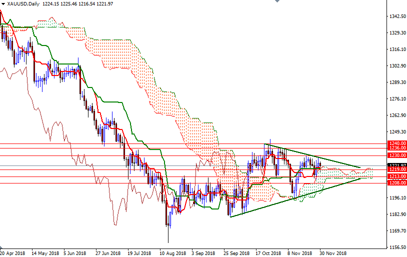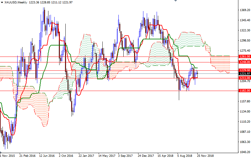 Gold prices settled at $1221.97 an ounce on Friday, suffering a loss of 0.12% on the week but making a gain of 0.57% over the month. XAU/USD tested a key technical resistance in the $1240-$1236 area at the beginning of November but failed to pass through. As a result, prices dropped below the $1213 level and returned to the daily Ichimoku cloud. Worries about rising interest rates have been a major factor working against the precious metal over the past few months, though the recent volatility in global markets prompted some buying interest in gold. The minutes from the Fed’s November 7-8 meeting showed that officials are on a course to raise interest rates this month, but they appeared more tentative about the pace of increases after that. Gold is still a dollar story so traders will be paying close attention to what the Fed will say at its final meeting of the year.