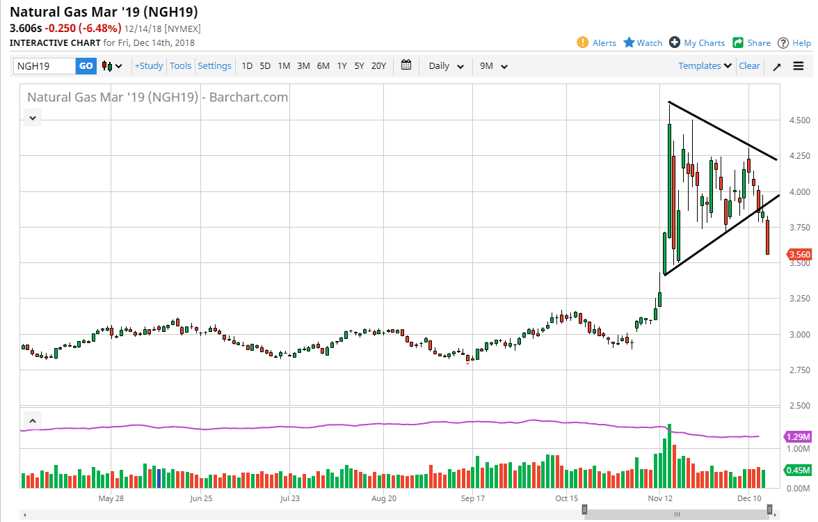 The natural gas markets collapsed during trading on Friday, dropping over 7% and now looks to test the $3.50 level. We switched over to the March contract, and that of course is a spring contract, meaning that demand should continue to drive. Beyond that, temperatures in the northeastern part of the United States have been very mild, so demand is falling through the floor. I do believe that rallies at this point continue to get sold, and we, as I’ve been saying for weeks now, have already seen the highs for the year. That doesn’t mean we will get the occasional rally, but every time you see a sudden move higher, you should be looking for signs of exhaustion to short this market. I believe at this point we have much lower to go as supply of natural gas is enormous.