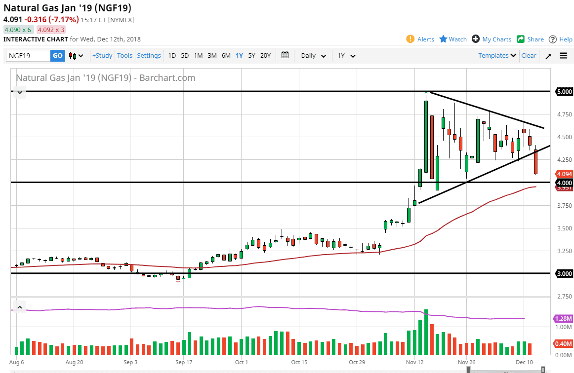 Natural gas markets collapsed during the trading session on Wednesday, slicing through the bottom of the symmetrical triangle that we have been trading in, showing that we are ready to start rolling over. At this point, I think the $4.00 level in the 50 day EMA will continue to offer support, and that short-term rallies will continue to be selling opportunities at the first sign of exhaustion. At this point, I would anticipate some type of bounce after losing almost 8% during a single session, but I think that we are simply looking for opportunities to short signs of exhaustion on short-term charts. I believe that we will go looking to fill gaps underneath at the $3.75 level, and the $3.30 level. I don’t have any interest in buying natural gas although I fully anticipate seeing it bounce from here.