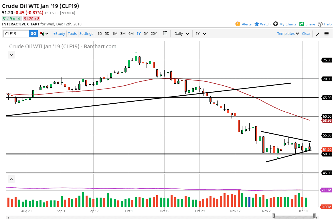 The WTI Crude Oil market initially rallied during the trading session on Wednesday, reaching the top of the consolidation triangle that we have been trading in. We are still within it, and I think at this point it’s likely to see a lot of volatility in the short term. If we can break down below the $50 level, then I think the market continues to go much lower. I will say that we have been selling rallies every time we get them on short-term charts, and that does cause a little bit of concern for the value of crude oil. If we break down below the $50 handle, I anticipate that we will go looking towards the $45 level. The alternate scenario is that we can break above the downtrend line of the wedge, and then perhaps go to the $55 level, possibly the $57.50 level after that.