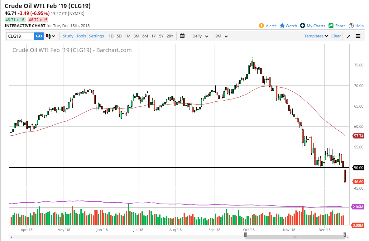 The WTI market finally broke down through the $50 level significantly, and it looks as if we are ready to go much lower. Because of this, I think that the market will continue to struggle overall and drop drastically. In fact, the flush lower has been rather strong as buyers have been crushed at what should have been a strong support level. Because of this, I believe we will continue to see a bearish pressure in this market, and the consolidation that had recently been holding up measures for a potential move down to the $45 level. I think there are serious concerns about global growth, and that of course will continue to weigh upon energy pricing. Beyond that, the US dollar has been strong and of course there has been so many waivers for sanctions against Iran, that any global shortage of crude oil is nothing but a distant memory.