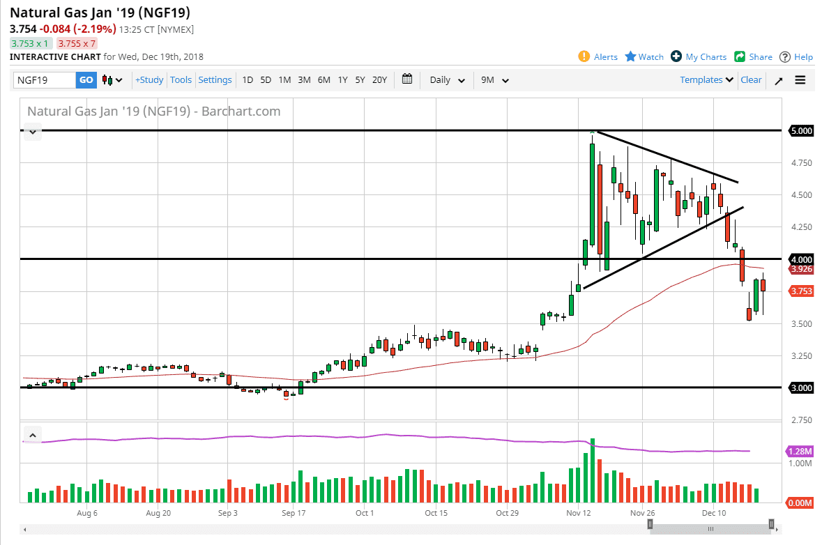 Natural gas markets have been very noisy during the trading session as per usual, after we have seen such a massive breakdown that of course isn’t much of a surprise. I think we are looking at a scenario that offers the $4.00 level as resistance, and that ultimately fading rallies in this market should also be a viable strategy. The 50 day EMA continues to offer resistance, and therefore I think it’s only a matter of time before we roll over. I look at signs of weakness as something that you should take advantage of, as the market had gotten far ahead of itself. I believe ultimately we will go lower, perhaps reaching towards the $3.00 level over the longer-term. We will of course get the occasional rally, but we will take advantage of that rally and sell it.