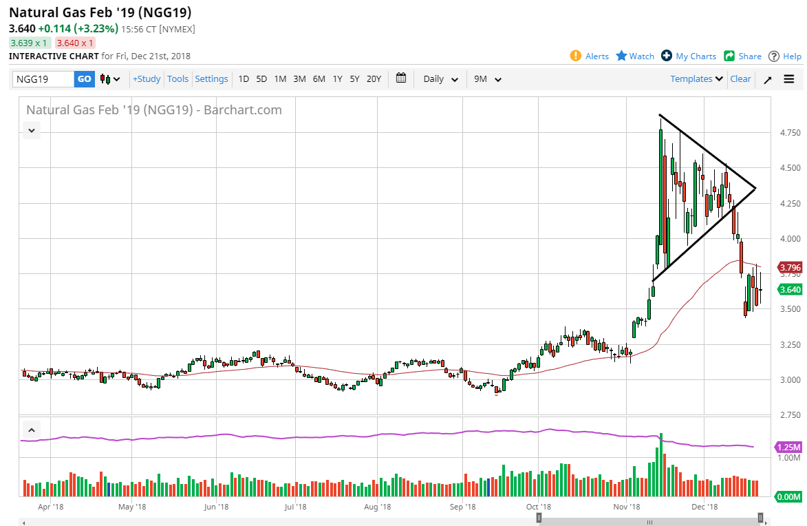 The Natural Gas markets went back and forth during the day, printing an unchanged candlestick. The 50 day EMA is just above and turning lower. The $3.50 level looks to be support, and it looks likely that rallies continues to be sold. I think at this point, it’s very likely that the rallies will be used as opportunities to start shorting. The supply will far outweigh the demand going forward, and it looks as if a warmer than usual winter is going to continue to put pressure on natural gas, not to mention the fact that we are looking at a potential global slowdown. I think at this point selling rallies continues to be the best way to trade this market and I think that the market will eventually target the $3.25 level.