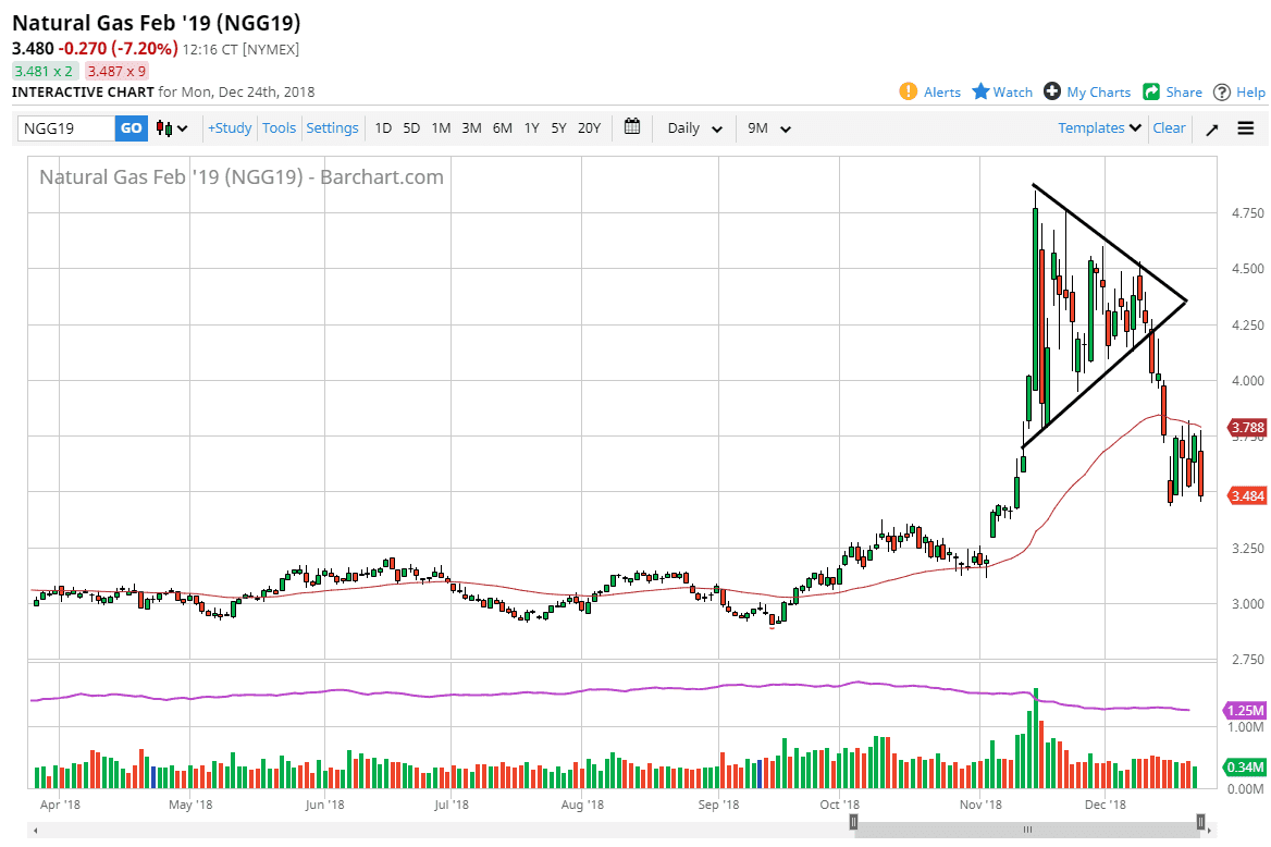 Natural gas markets initially rallied during the trading session on Monday as well, struggling at the 50 day EMA. By doing so, we have fallen out of bed again, breaking down through the $3.50 level. It looks as if we are going to go down to the $3.25 level, and it seems likely that we are going to continue to see this market get hammered every time it tries to rally. I would use short-term charts to get involved, but at this point I think the only thing you can do is sell this market. The 50 day EMA is turning lower, and it looks to be very resistive. There is a longer-term situation when it comes to natural gas, as there is far too much in the way of supply to worry about the man taking that out.