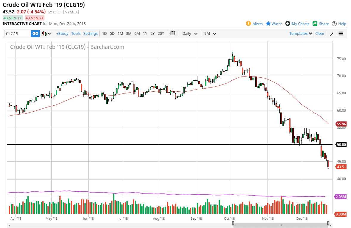 The WTI Crude Oil market initially rallied during the session on Monday, but then broke down rather significantly, slicing through the $45 level. That of course is a very negative turn of events, as we have wiped out another large come around, psychologically significant level. Oil simply cannot get out of its own way, and therefore it looks as if we are going to continue to go lower. I can’t call this capitulation yet, but it certainly looks as if we are going to continue to struggle. Given enough time, there should be an excellent buying opportunity but we are nowhere near that from what I see. The $50 level above is resistance, but at this point it’s likely that the $47.50 level will be resistance as well. There is nothing good about this chart right now.