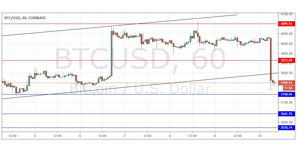 I wrote yesterday that I would be bullish following a healthy bounce at $3,914 or following a sustained break above $4,100. I noted that the price had room to rise beyond $4,100 for some way until it would meet the next resistance level. This was a fairly good call, at least good enough to keep out of trouble, as the price failed to rise and crashed down below the support and out of the bullish channel just a few hours ago. This is a bearish sign, but the price is really just back at a recent base so I would not want to get bearish while the price is still above $3,741 which is likely to be the pivotal level today. I suspect there will be better opportunities over the days ahead and the price will need to settle now before finding direction, unless it does break below $3,741 in which case, I would take a bearish bias.