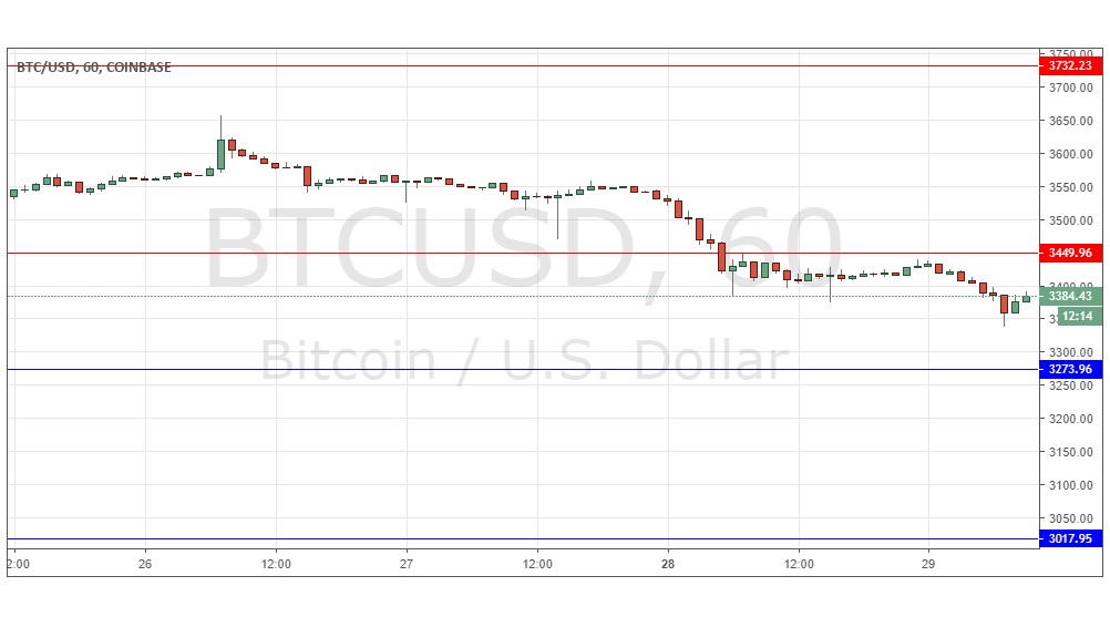 I wrote yesterday that the price had just broken below a formerly supportive area at $3,450 which now looked likely to hold as resistance. I took a bearish bias below $3,450 and above $3,274. This was a good call: the resistance held, and the price continued to move down. The picture remains slightly bearish, but the action is quite dull, and I doubt there will be any good opportunities here today, so I take no bias now. A break above $3,450 would be a bullish sign.