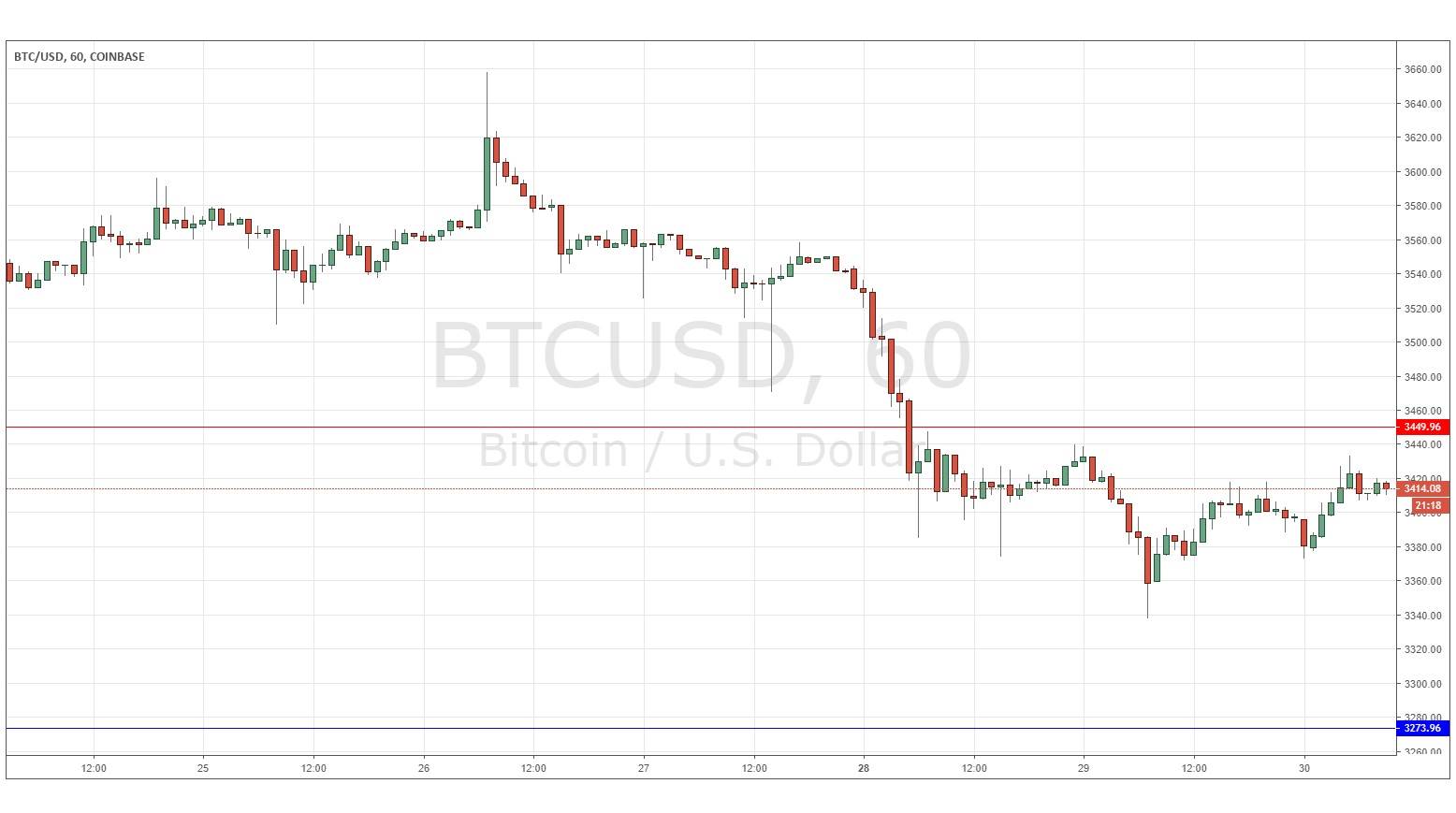 The price has remained below the resistance at $3,450 which is a bearish sign but has failed to move down and in fact has printed some bullish price action with the final leg of a bullish “over and under” pattern seeming to form. As such, a bullish break above $3,450 over the next few hours would probably be a significantly bullish sign, so I would take a bullish bias if the price trades above that level today for a couple of hours.