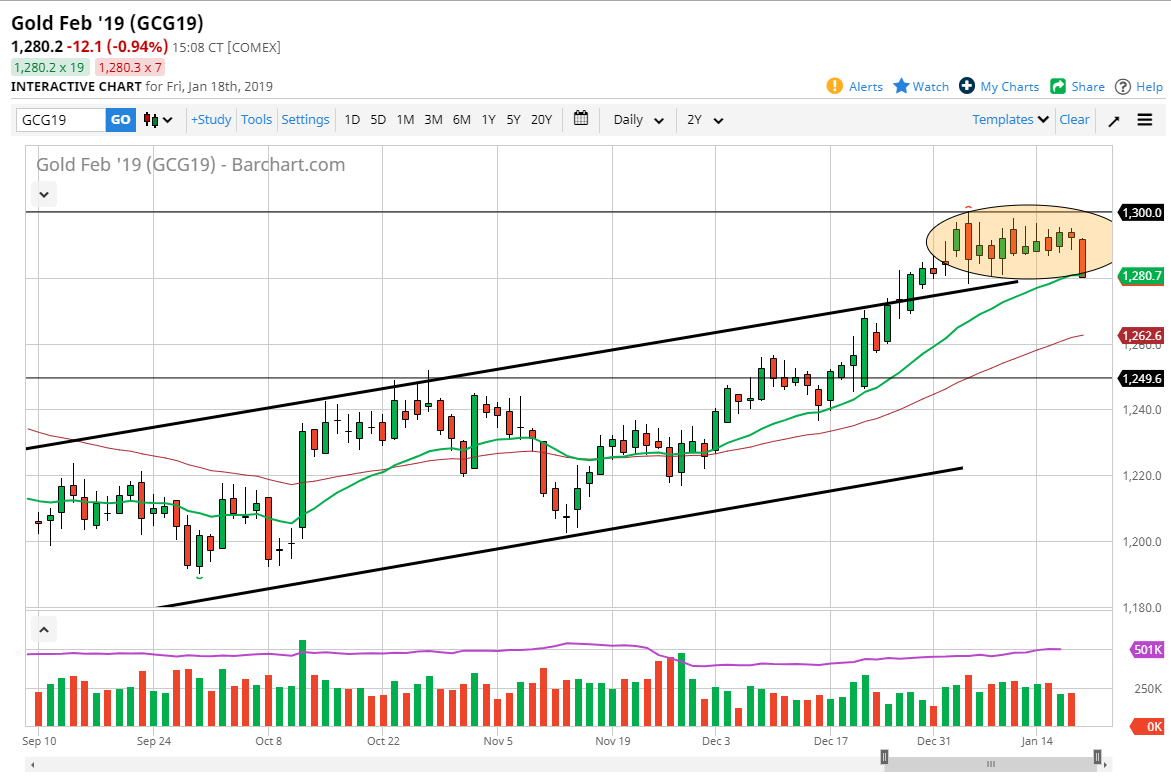Gold markets fell hard during the Friday session, crashing into the $1280 level, an area that I believe is significant support. This bearish candle is a bit concerning for people who are buyers, but I also believe that underneath there is a lot of support. Gold markets continue to move based upon the US dollar, which had a strong day on Friday. That being the case, you should pay attention to the EUR/USD pair, and he gave back some of the gains, so of course Gold fell. Ultimately, I think that we will see buyers reenter the market, as we are now testing the top of the previous uptrend channel, and the 20 day EMA which has been fairly reliable.