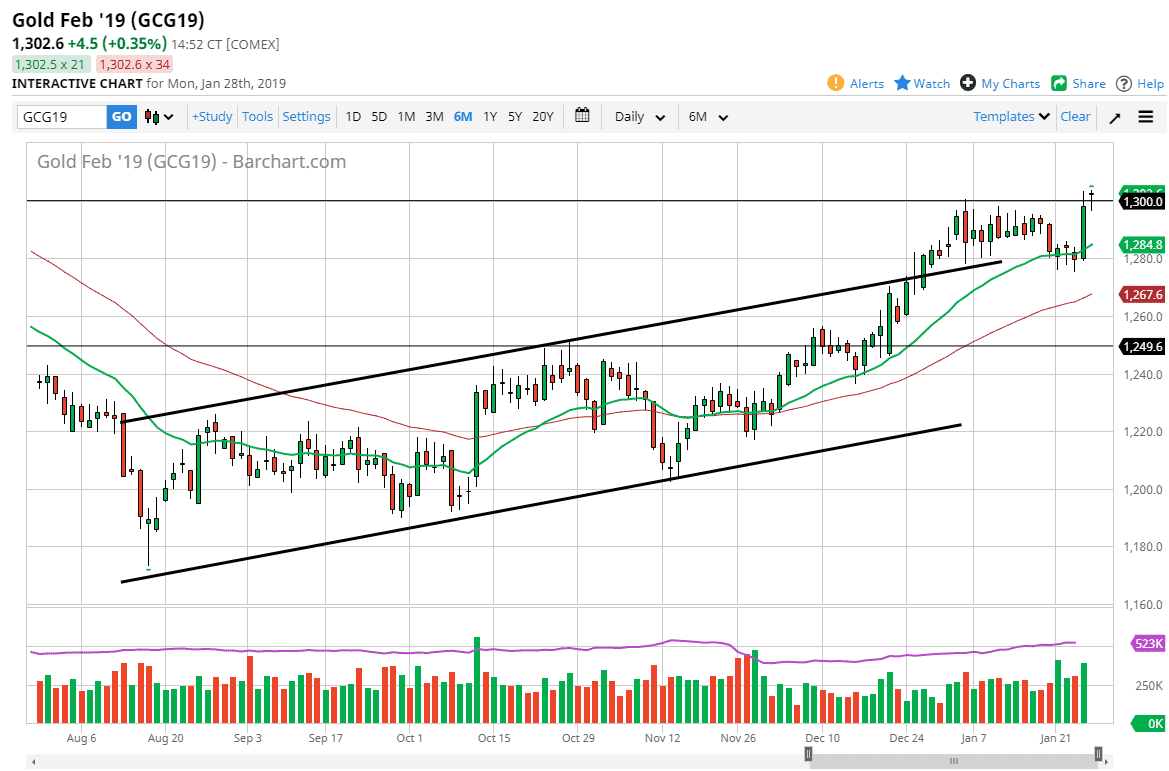 The Federal Reserve of course will come into focus this week, as the FOMC statement on Wednesday could give us some hints as to whether or not the Federal Reserve is looking to slow things down again. If they are, that should continue to put upward pressure on gold. Beyond that, we have a lot of global concern out there that will perhaps make gold a bit attractive as well. With the combination of a US dollar that is losing strength, and a lot of concern around the world, is very possible that we will continue to see traders try to pick up gold for a bit of a safety play. I think ultimately that the market will continue to reach towards the $1320 level initially, based upon the previous consolidation area that started at the $1280 level. Pullbacks should continue to offer plenty of value.
