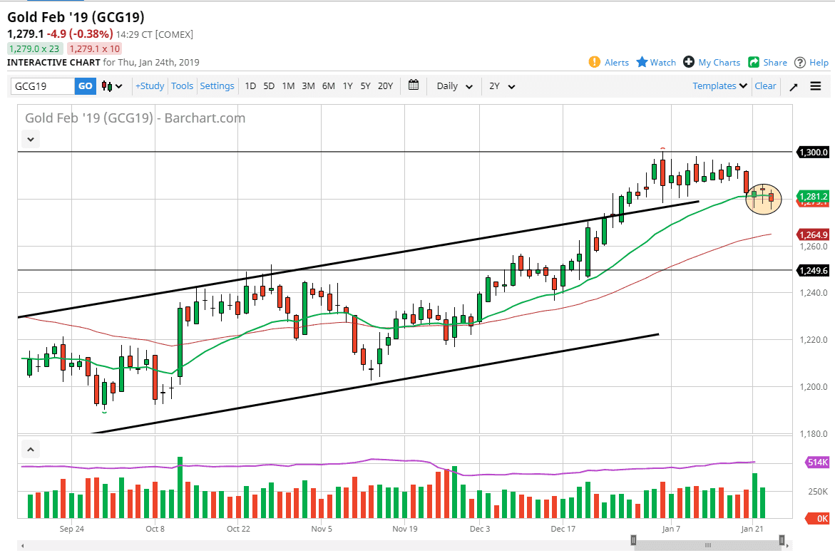 Gold markets initially dipped during the trading session on Thursday, slicing through the $1280 level before bouncing again. In fact, we have formed the third hammer in a row, right at an area that should offer support anyways. Because of this, I believe that the market is getting ready to rally and we will eventually take off to the upside. If we can break above the candle stick for the Wednesday session, then it opens the door to the $1290 level, followed by the $1300 level which is a significant resistance barrier. This of course is the most obvious trade and the fact that the 20 day EMA is hanging about in the same area and acting as support makes sense as well.
