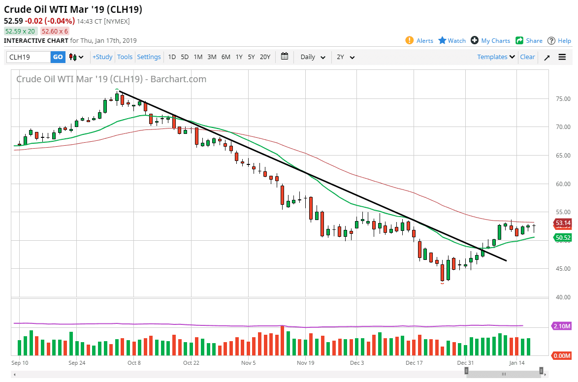 The WTI Crude Oil markets spent most of the day falling on Thursday after initially opening somewhat flat. However, we found enough support underneath the turn things around and form a bit of a hammer. We are currently trapped between two major moving averages, so I think at this point the best thing to do is to simply let the market break out before you put money to work. If we can get a clean and significant daily break above the 50 day EMA pictured in red just above, then you have a nice buying opportunity. At that point I would anticipate that the market will reach towards the $55 level, and then possibly the $57.50 level. Ultimately, if we get a significant break down below the 20 day EMA, pictured in green on the chart, then I think the market could go back to the $47.50 level to look for support. I do think that recent price action favors the buyers though.