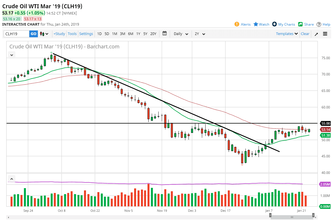 The WTI Crude Oil market has rallied a bit during the trading session on Thursday, as we continue to bounce between the 20 and the 50 day EMA indicators. By going sideways, we have shown resiliency that is a bit surprising considering that the EIA reported that there were was an increase of 8 million barrels to US inventory. That is a very negative sign, but at this point the market refuses to drop. I think what we are waiting on is whether we can break above the $55 level. If and when we do, that releases the market to go much higher, perhaps adding to the $57.50 level, and then the $60 level after that. In fact, I believe that we are in the process of trying to form an “inverse head and shoulders.”