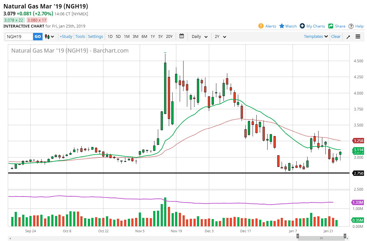 Natural gas markets gapped higher during the open on Friday, pulled back to test support, and then turned around of form a hammer. This is a bullish sign obviously, but at this point I think there is plenty of resistance above to keep this market down. The 50 day EMA above, pictured in red, I think is a selling opportunity. The $3.25 level is significant resistance, but even if we broke above there I think the $3.50 level is difficult as well. If you go to the upside now, we should see an exhaustive candle that you can take advantage of and start shorting due to the oversupply that we have in this market. The $2.75 level underneath continues offer massive support though. Short-term rallies will offer short-term selling opportunities.