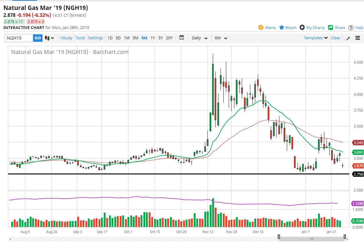 Natural gas markets gapped lower during the open on Monday, then essentially went nowhere. I think the gap will get filled, so I suspect that the short term movement is probably to the upside. However, I still believe that the easiest trade in this market is to simply sell on signs of exhaustion above. I think at this point, selling is all but impossible, and I would be surprised to see this market break down below the $2.75 level in the short term. I think that is massive support, but I do believe in the downtrend overall as we have plenty of reason to think that the natural gas markets will continue to be plagued by oversupply.