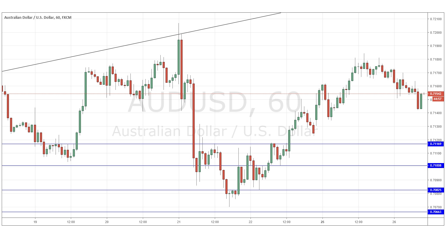 Go long following some bullish price action on the H1 time frame immediately upon the next touch of 0.7117, 0.7100, or 0.7083.