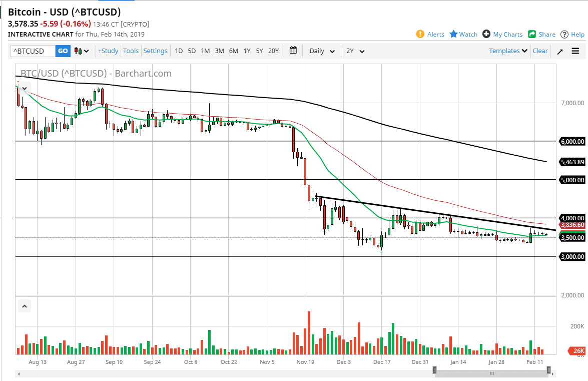 Bitcoin markets did very little during the trading session on Thursday, as we continue to go sideways as the 20 day EMA level. This is a very important moving average for this chart, as it has been very predictive of where the market is heading. Currently, the 20 day EMA is sitting right at the 3500 level, an area that of course will attract certain amount of attention. The EMA is flat now, so that tells me that this market is going back to sleep.
