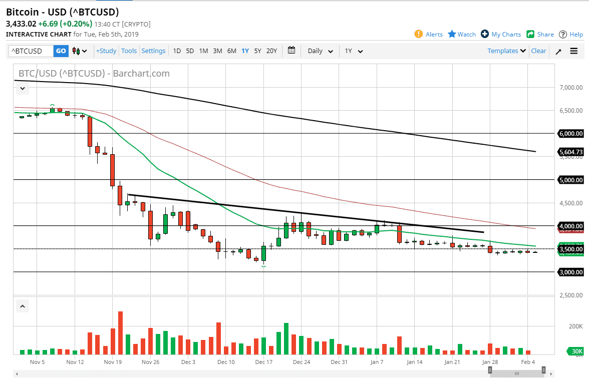 Bitcoin did very little during the trading session again on Tuesday, as we continue to hover underneath the $3500 level. That’s a level that of course has attracted a lot of attention in the past, being massive support over the course of several weeks, and now it looks as if it is attracting a lot of attention again as resistance. At this point, the market looks as if it is essentially flat, and the volume has dried up yet again. In that sense, this is a market that is all but untradeable. However, many people believe that this market is waiting for some type of catalyst, and at this point we simply don’t have it. Looking at this chart, there is nothing that makes me think that we are going to rally, because we have multiple reasons to see selling above.