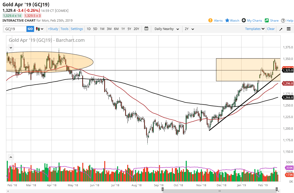 Gold markets pulled back a little bit to kick off the week on Monday, testing support at the $1325 region. We could not continue to go higher after initially trying to rally, so it suggests that perhaps we need to pullback just a bit. This makes sense, we are in the middle of major resistance that extends to the $1350 level.