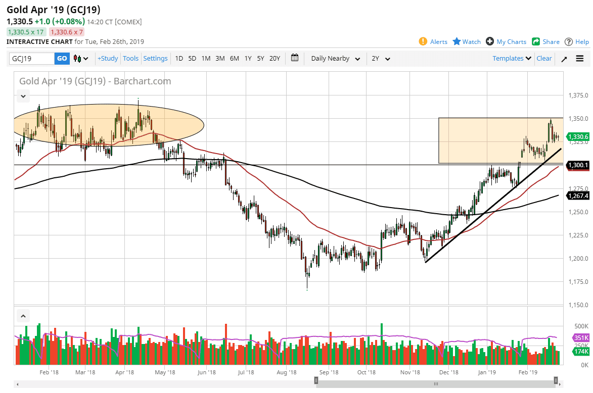 Gold markets initially fell a bit during the trading session on Tuesday but continues to see buyers jumping in at roughly $1325. This is an area that was previous resistance, and as gold markets tend to move in $25 increments, it makes an interesting spot on the chart to say the least. The fact that we bounced from there should not be a huge surprise, but all being said, it was a relatively quiet session.