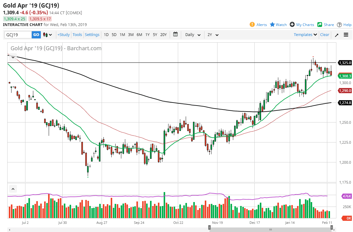 Gold markets struggled a bit during the trading session on Wednesday as we continue to see selling pressure above and near the $1325 level. This is an area that has been rather negative for gold, and it does bring in a significant amount of selling pressure. We are currently dancing around the 20 day EMA and I do think that there are buyers below. However, gold is starting to show signs of weakness, or at least being overbought and that the buyers may need to find lower pricing to get above the massive resistance that sits overhead.