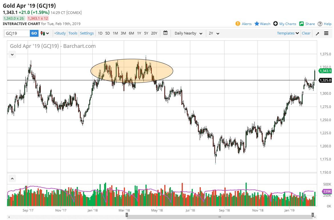 If we can break above the $1350 level, the crack in the ice will become the dam opening up, and the gold market should very quickly go heading towards the $1400 level. At this point, I like the idea of buying pullbacks in gold, because the strong uptrend certainly looks likely to continue. Looking at this chart, you can say that we just broke out above a bullish flag, and of course have cleared a significant resistance. Those are a couple of really good reasons to think that we should continue to see strength, so look for value and you should be rewarded.
