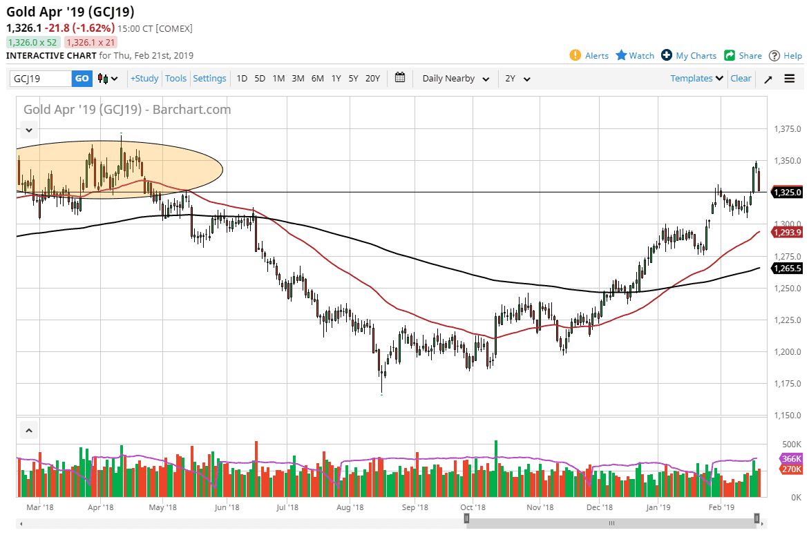 Gold markets got hammered on Thursday as the US dollar strengthened a bit, and of course we had hit major resistance. However, by the end of the day we are parked at a significant level that should offer a bit of support. The 1325 level was major resistance, and now we have come complete round turn from the rally. I believe that it’s only a matter time before the buyers come back in and try to pick this market up, but the close was a bit to be concerned about.