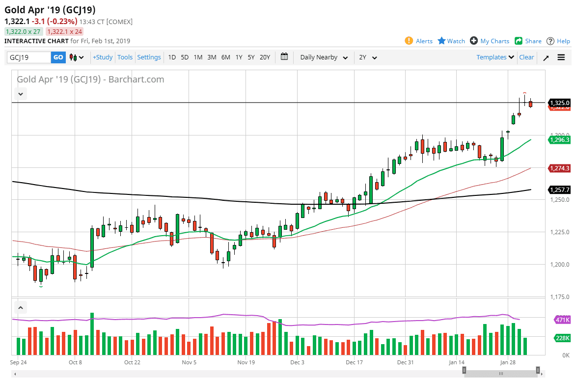 Gold markets pulled back a little bit during the trading session on Friday, as the $1325 level has caused too much resistance. We ended up forming a shooting star on both Wednesday and Thursday, so that of course is very bearish. It shows signs of exhaustion, and perhaps we had gotten a little too far ahead of ourselves. Overall, I think that the market needs to pullback but the trend is still most certainly to the upside. With that being said, I think that a retest of the $1300 level makes a lot of sense, as the 20 day EMA is sitting right there. Beyond that, the $1325 level has been important more than once in the past, so it makes sense that we had to stop. The US dollar has drifted a bit lower in general, so I think that should continue to propel gold to the upside but I’m not looking for a major move in the short term.