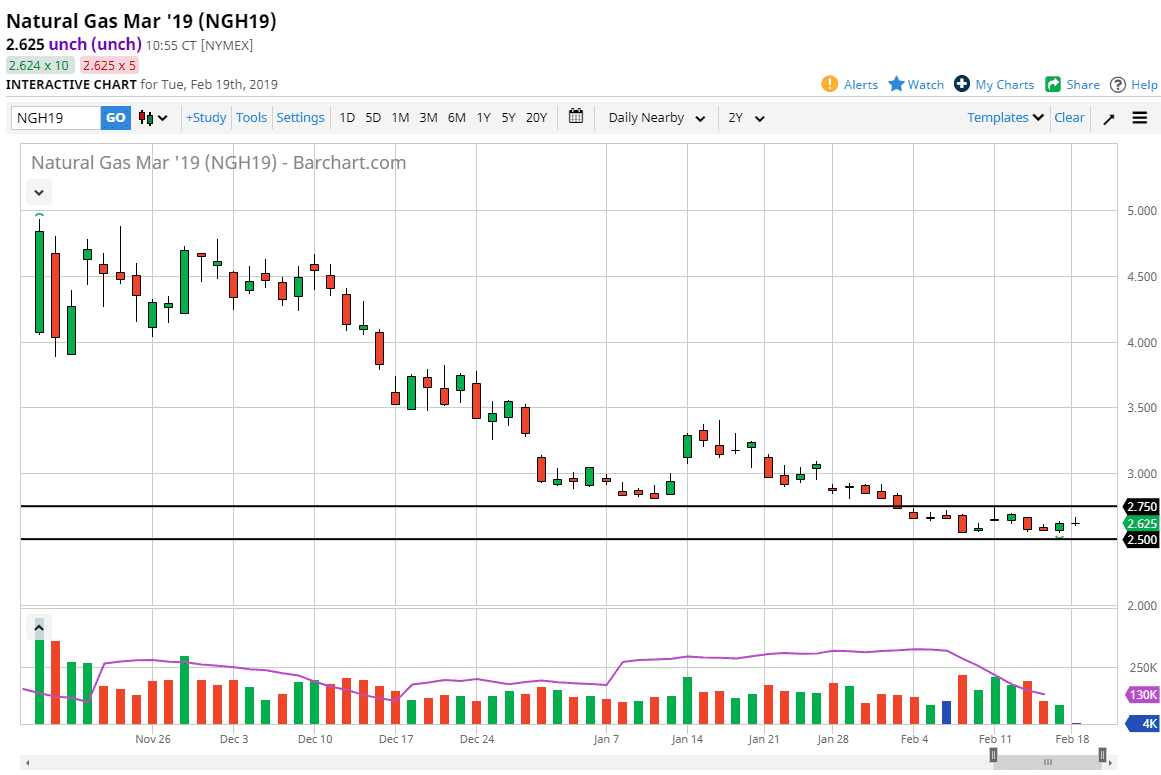 Natural gas markets did almost nothing during the trading session on Monday which of course isn’t much of a surprise due to the fact that the United States was celebrating Presidents’ Day, which while not a major holiday it is one that a lot of banks will participate in. Because of this, the markets had a short trading session, closing at noon in America. That makes a huge difference in what happens in the natural gas markets particular, because almost all of the volume comes out of North America.