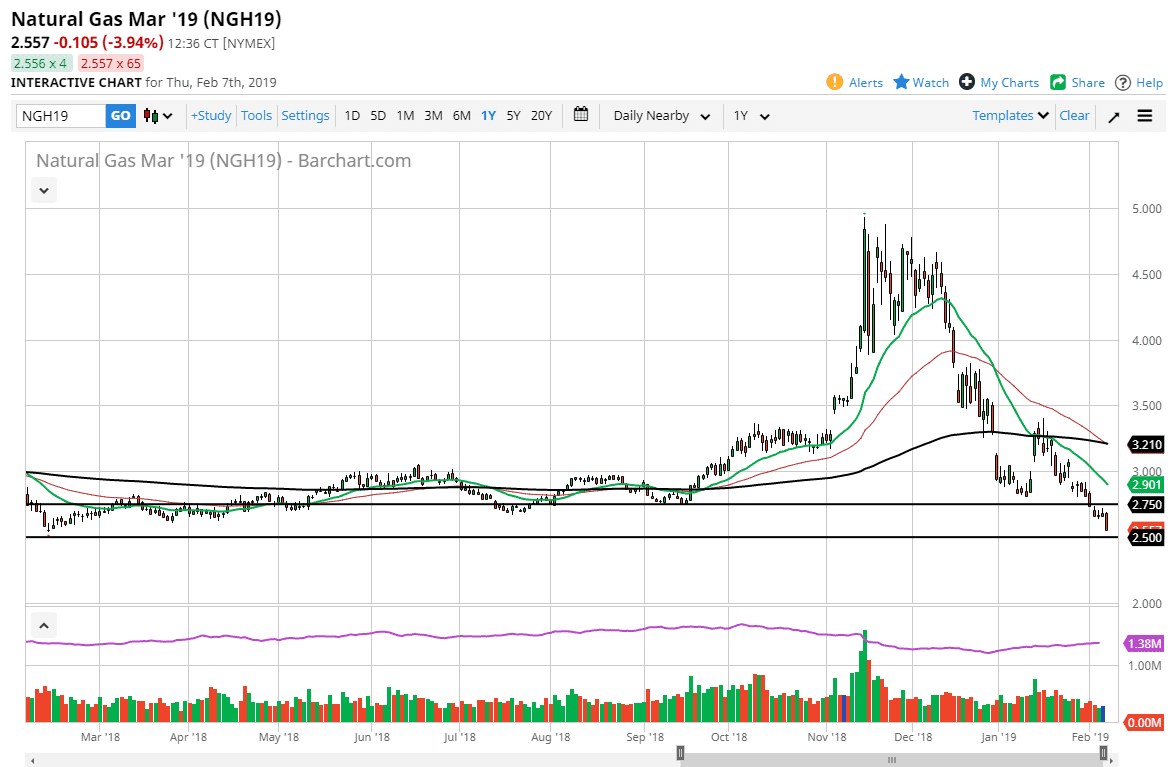 Natural gas markets fell significantly during the trading session on Thursday, reaching down towards the $2.50 level, an area that is massive support on longer-term charts. I’m looking for an opportunity to short this market but chasing the trade isn’t what I want to do. We will get some type of relief rally but it may be days, if not a few weeks before we get an opportunity to sell at a reasonable price.