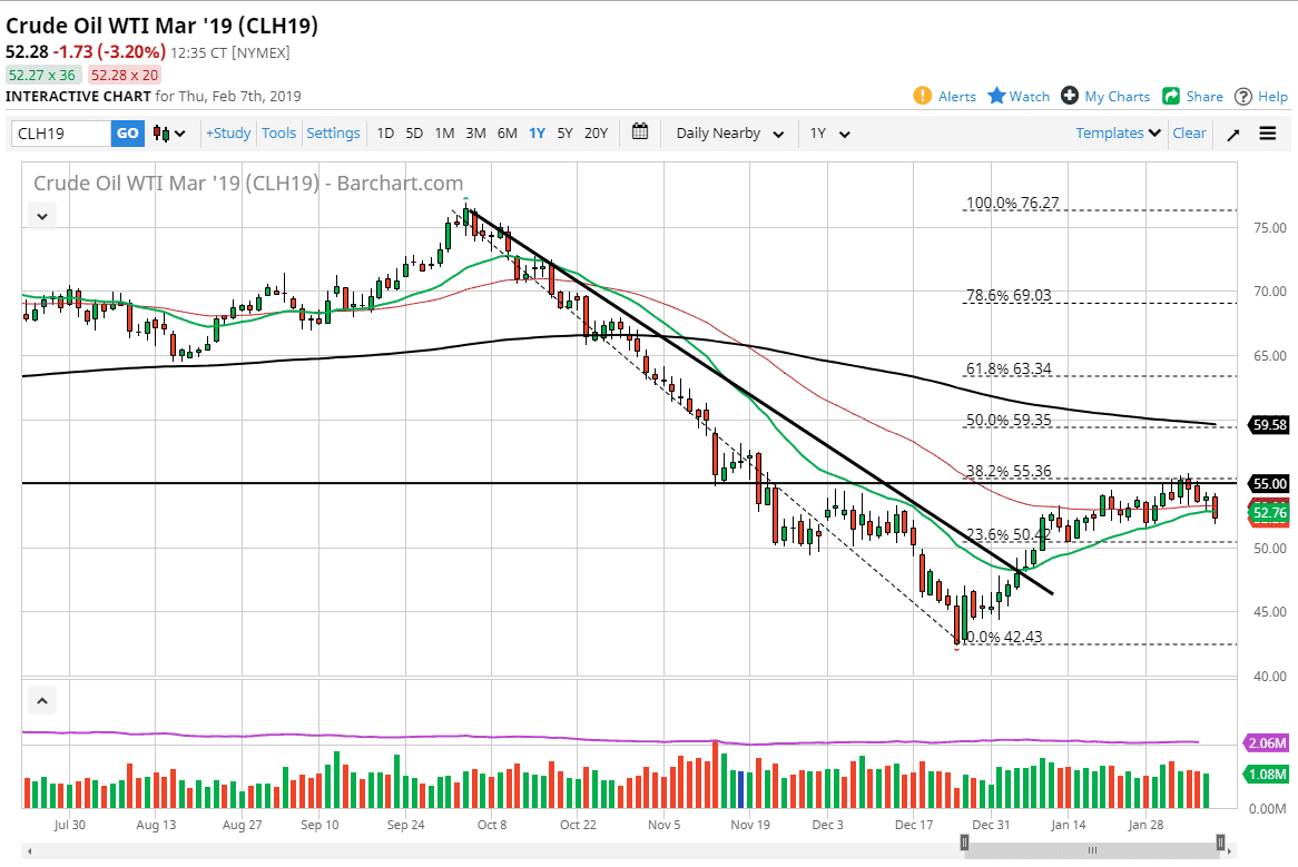 The WTI Crude Oil market fell significantly during the trading session on Thursday, slicing through the 20 day EMA and the 50 day EMA. That’s a very negative sign, but there is a certain amount of support underneath. I believe that the $50 level underneath will be a bit of a “floor” in the market, but if we were to break down below there it could change everything. This candlestick could be the beginning of something negative going forward, and it appears that the sellers are starting to take over a little bit. At this point, I think that we are still grinding sideways in general, but it’s starting to look a little less in the way of bullish as this candlestick has done some technical damage. At this point, the $50 level must hold for any attempt to rally can be taken seriously. I’d be on the sidelines for Friday.