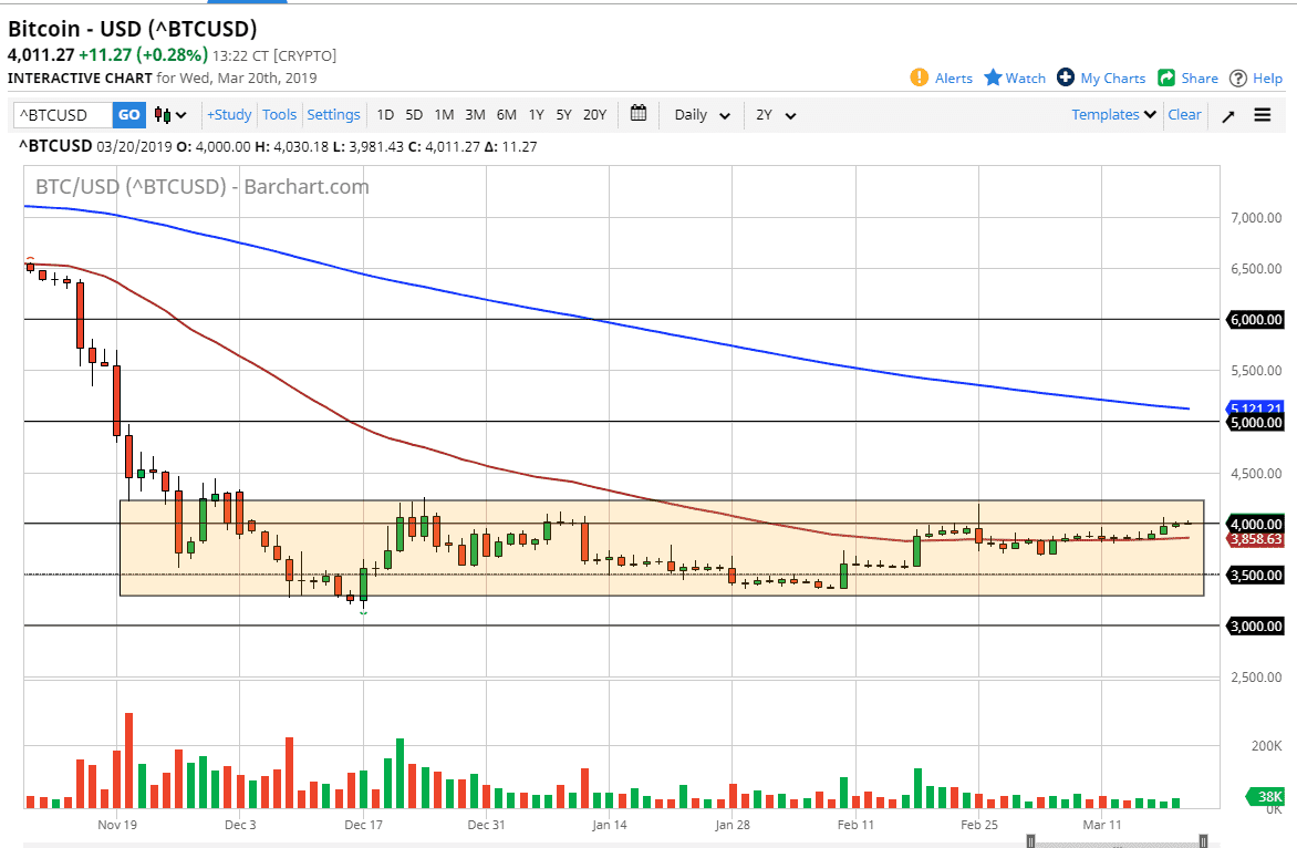 Bitcoin markets rallied slightly during the trading session on Wednesday as we continue to see a quiet rally form. The $4000 level is now starting to become an area that is very comfortable, and that of course is a good sign. Ultimately, the market looks likely to see a bit of hesitation in this area, perhaps extending all the way to the $4250 level above. After all, this is an area that has been very resistive recently, so if you can break above there it’s likely that we could go much higher.