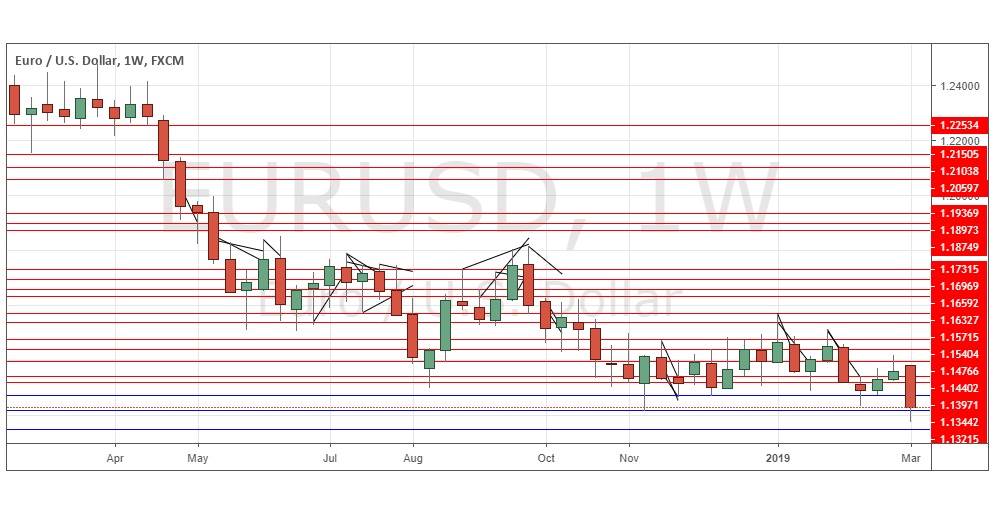 The weekly chart below shows last week produced a relatively large, strongly bearish candlestick, which reached a new 18-month long-term low price, which is a bearish sign. Long-term lows are always bearish indicators, but this pair does tend to move slowly with deep retracements, so it may take a while to fall further. There is no doubt that we have a significant long-term bearish trend here with a breakout from a recent multi-week price range.