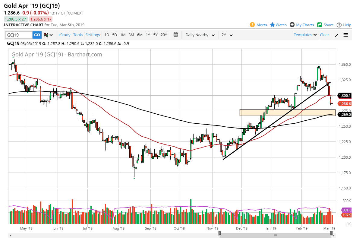 Gold markets pulled back a bit during the trading session on Tuesday but did find a bit of stability by the end of the day. By doing so, it looks as if the market is trying to find its footing, and I do recognize that the area underneath at the $1275 level should offer plenty of support as well. Just below that level, we have the 200 day EMA which of course always attracts a lot of attention. With that being the case, I think that the downside is somewhat limited, at least in the short term, because we are oversold regardless, and at the very least we need to see some type of bounce to get more movement to the downside. I think the $1300 level above, and of course the 50 day EMA will both offer a bit of resistance higher.