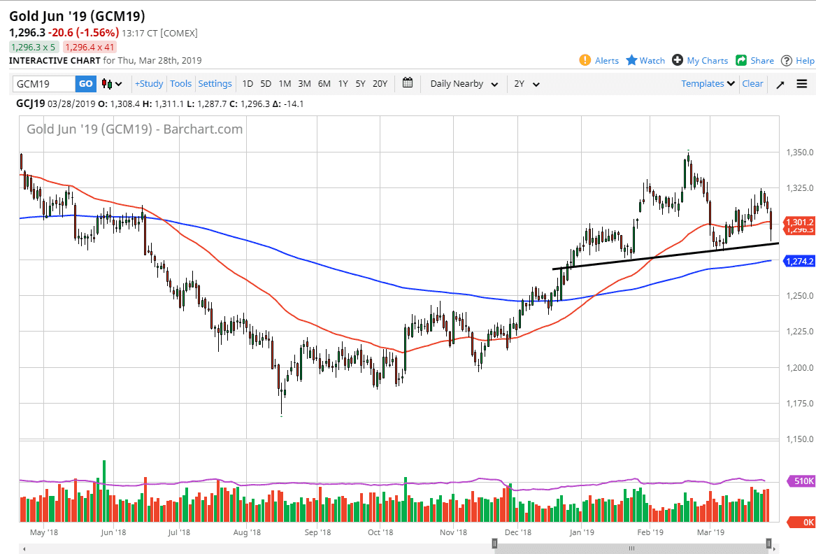 Gold markets fell significantly during the Thursday session as the US dollar accelerated its gains. However, we have seen a bit of a recovery later in the day so it’s likely that the market will hold its own. Looking at this chart it’s likely that the trend line now on the chart will be something to pay serious attention to, as it could now be the neckline for a head and shoulders pattern. With that in mind, it’s important to pay attention to and therefore will continue to be crucial.